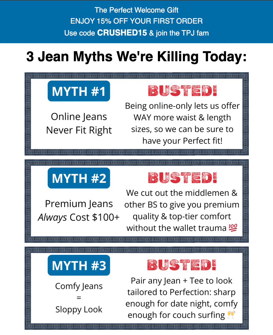 If you take a different approach to your product category, use a “myth busting” framework to highlight that. In this example, The Perfect Jean provides an alternative to denim that is expensive and uncomfortable.